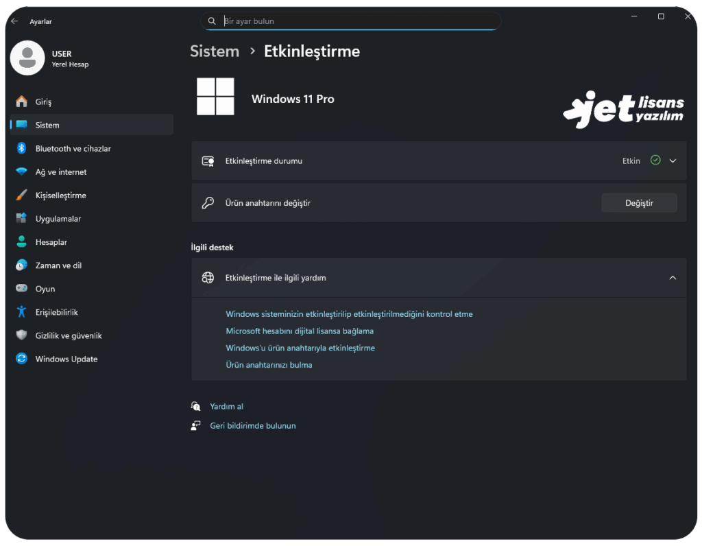 Windows 11 Pro lisans anahtarı girme ekranı ve etkinleştirme durumu